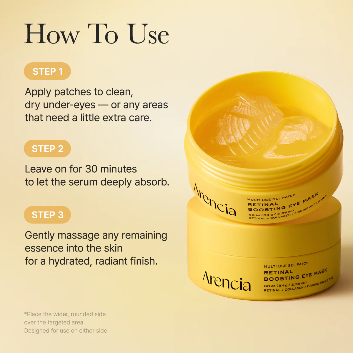 Uzklājiet patčus uz tīras, sausas ādas zem acīm un atstājiet uz 15-20 minūtēm. Noņemiet un viegli iemasējiet atlikušo esenci ādā.