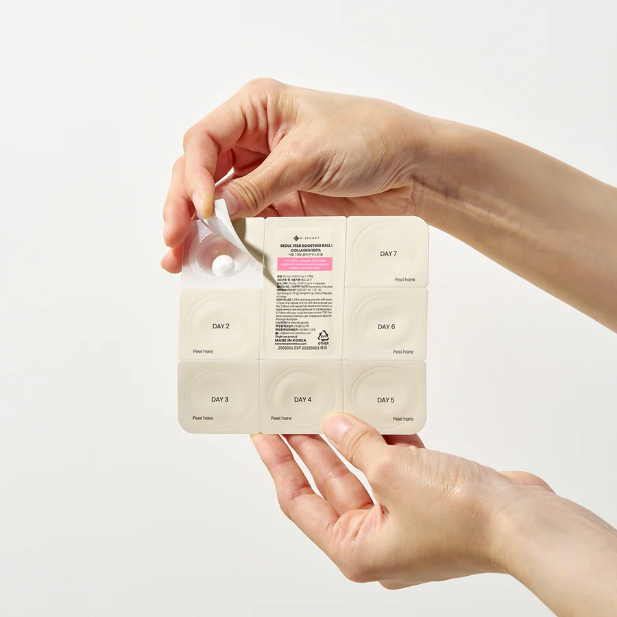 Sejas ādas kopšanas būsteris liofilizētu bumbiņu formā, kas izgatavotas no 100% hidrolizēta kolagēna.