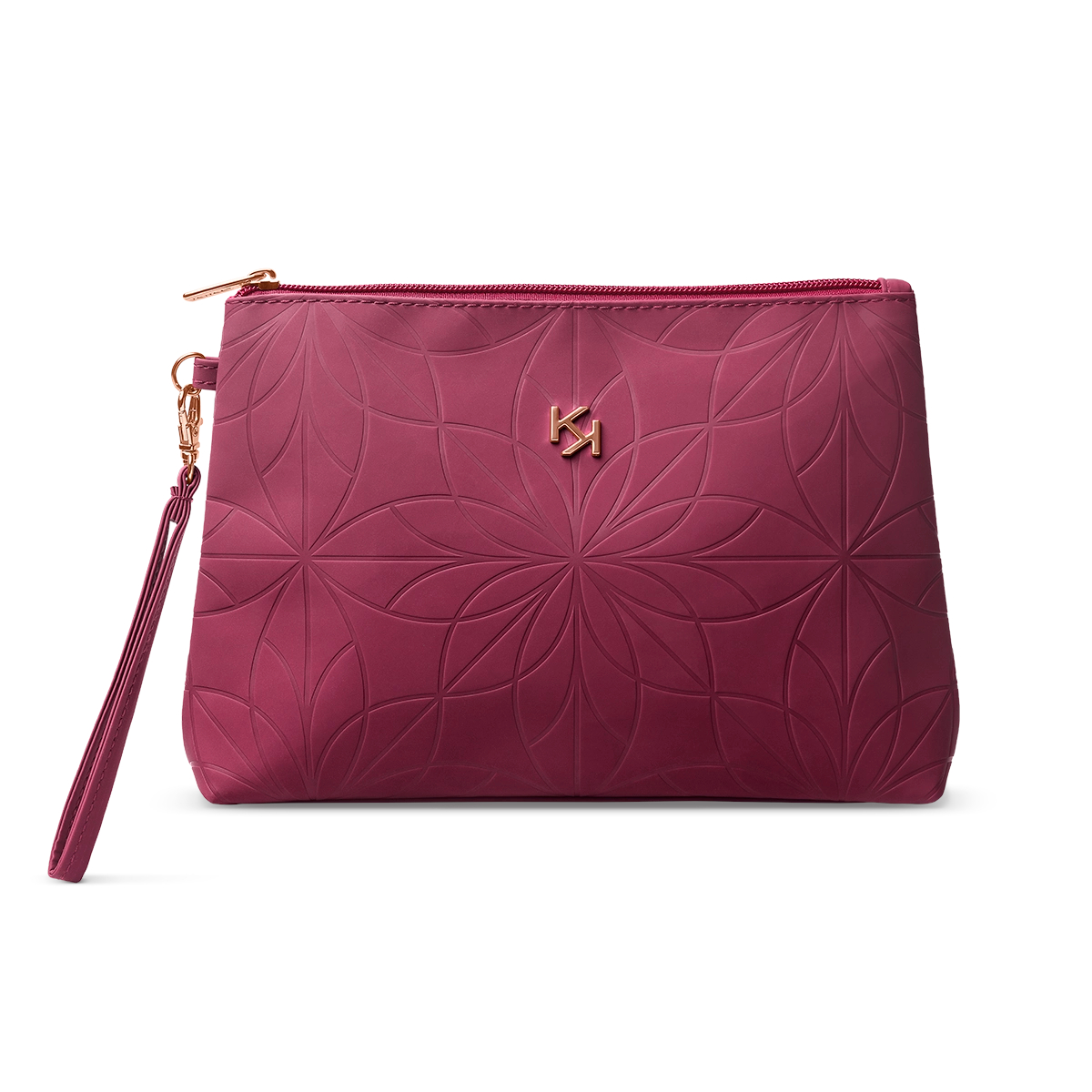 Kosmētikas un aksesuāru maciņš burgundijas tonī ar zelta krāsas ikonisko KIKO logo un rāvējslēdzi.