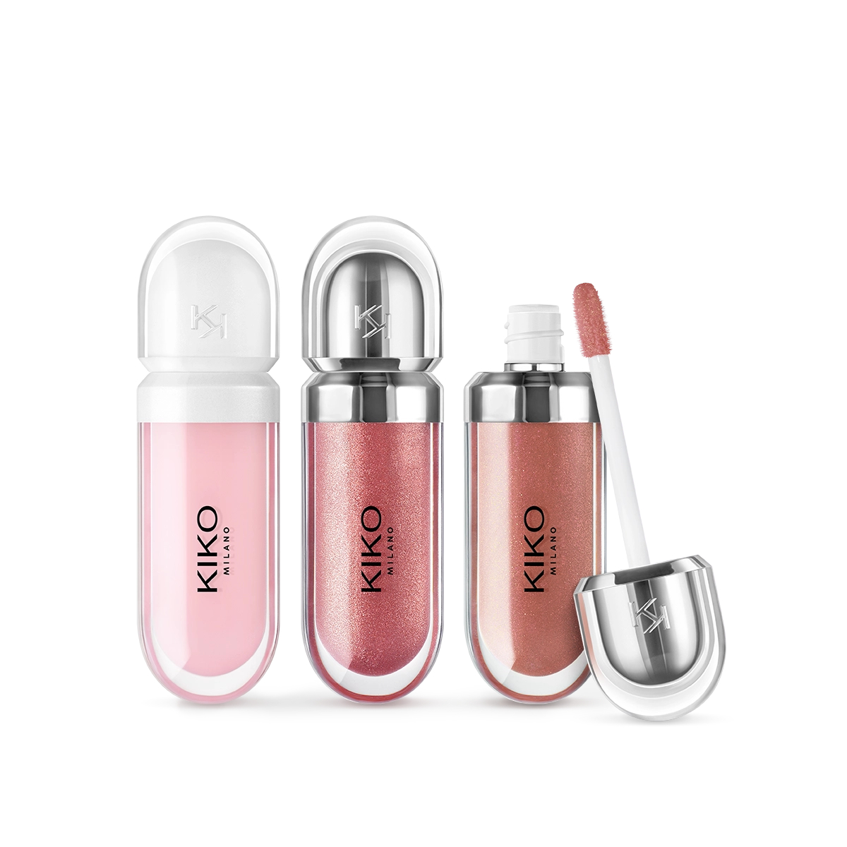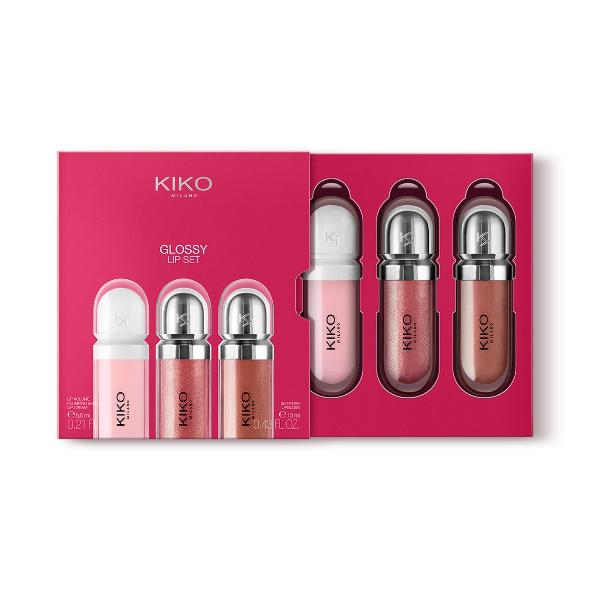 Komplekts, kas satur 2 mitrinošus lūpu spīdumus un 1 pilnveidojošu apjomu palielinošu lūpu krēmu.