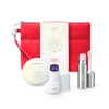 Dāvanu komplekts roku, sejas un lūpu kopšanai, kurā ietilpst roku krēms, sejas zīmulis ar SPF 50 un lūpu maska – tas viss iepakots īpaši stilīgā auduma maciņā.