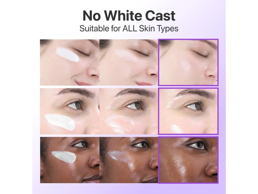 Vieglas tekstūras esence, kas nodrošina augsta līmeņa UV aizsardzību, vienlaikus sniedzot dziļu mitrināšanu un starojošu, maigu finišu.