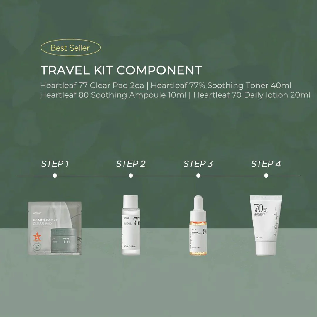 ANUA Heartleaf Soothing Trial Kit – набор из четырех продуктов в мини-упаковках, которые обеспечивают полноценный базовый уход за кожей, а также идеально подходят для путешествий.